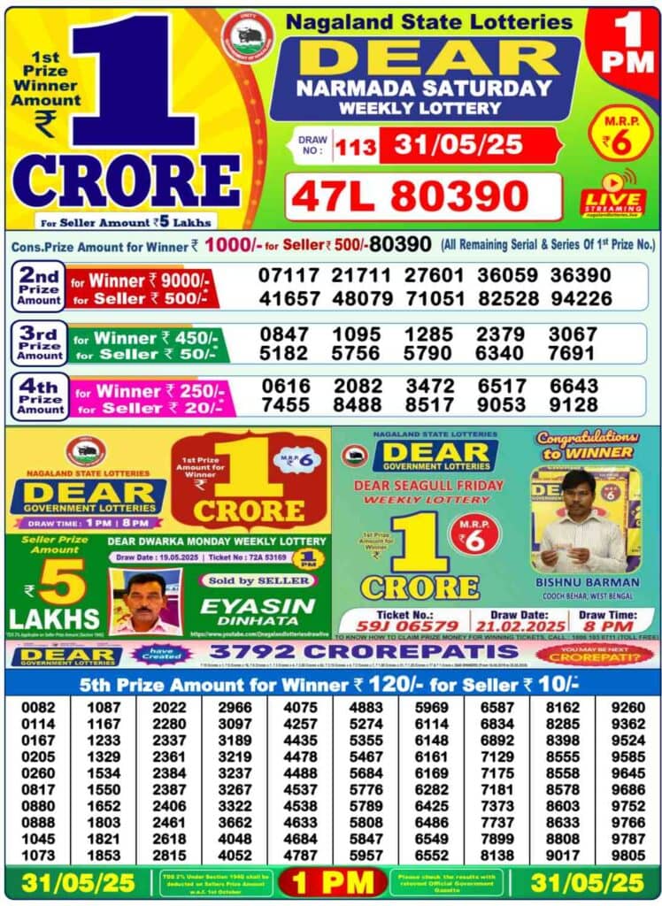 Nagaland State Lottery Results - Saturday, 31 May 2025: Check Winners for DEAR NARMADA, DEAR DONNER, DEAR STORK, 1 PM Lottery Result 31-05-2025 (OUT): Live updates for Saturday's Nagaland Sambad State Lottery results. DEAR NARMADA, DEAR Donner, DEAR Stork 8 PM lottery winners declared today. First Prize: ₹1 Crore. Check the complete winners list now!