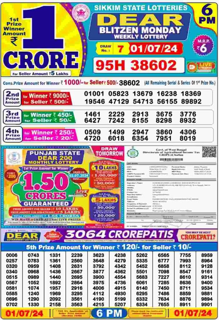 Nagaland DEAR 6 PM Result: 1st Prize Ticket No. 95H 38602