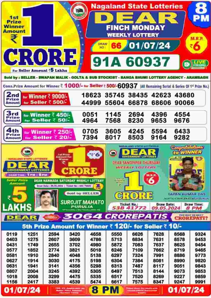 Nagaland State Lottery Monday, 01 July, 2024: The results of Nagaland State Lottery DEAR DWARKA MORNING 1 PM, DEAR BLITZEN 6 PM, DEAR FINCH EVENING 8 PM weekly lottery will be declared today i.e. Monday, at 1 PM, 6 PM and 8 PM respectively. To view the list of winners, scroll down.