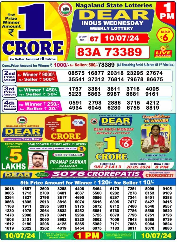 Nagaland DEAR INDUS Morning 1 PM Result: 1st Prize Ticket No 83A 73389