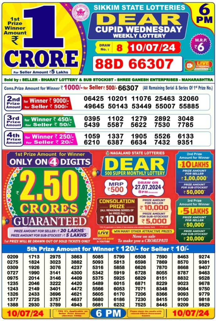 Nagaland DEAR CUPID Day 6 PM Result: 1st Prize Ticket No. 88D 66307