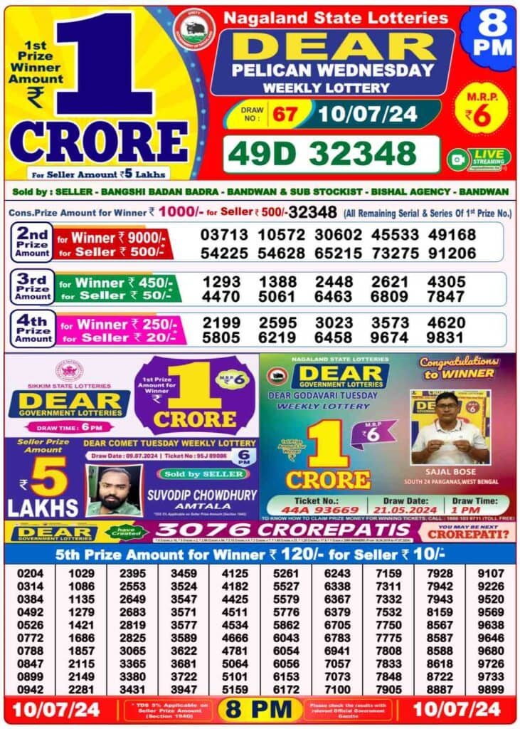 Nagaland DEAR PELICAN Evening 8 PM Result: 1st Prize Ticket No. 49D 32348