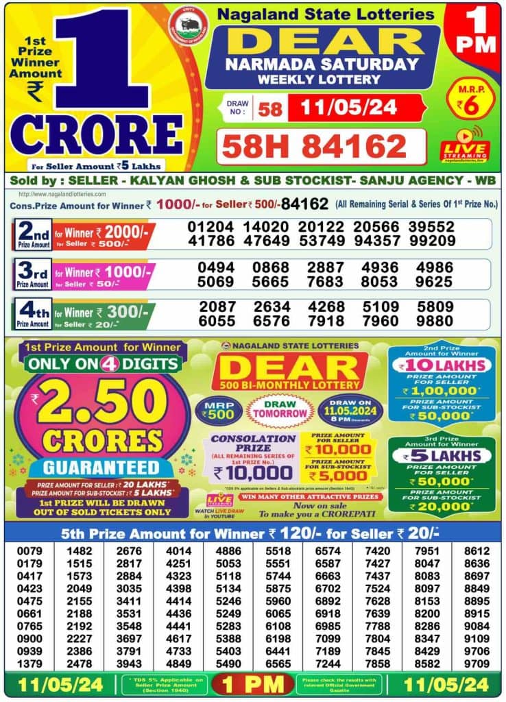 Dear NARMADA SATURDAY 1 PM Lucky Winners: 1st Prize Ticket No 58H 84162