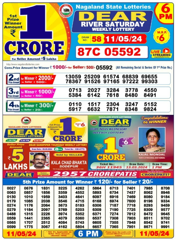Nagaland DEAR RIVER Day 6 PM Result: 1st Prize Ticket No 87C 05592