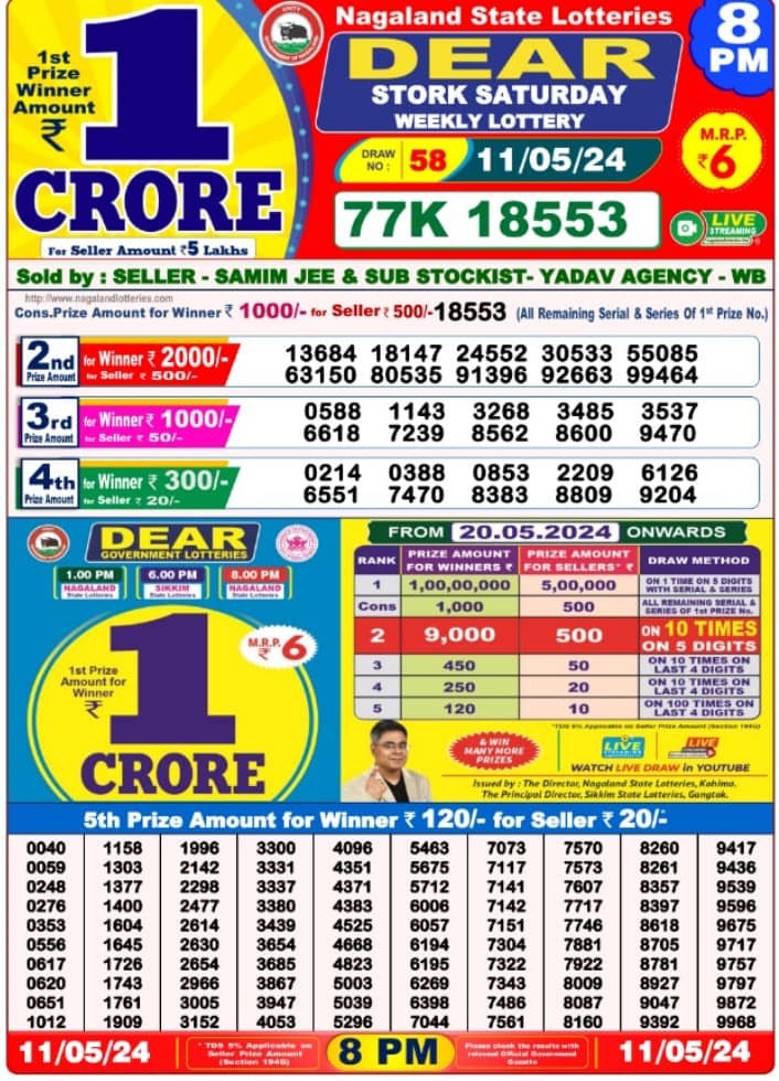 Nagaland Lottery Dear STORK Saturday 8 PM Result Out: 1 CRORE- 1st Prize Winner