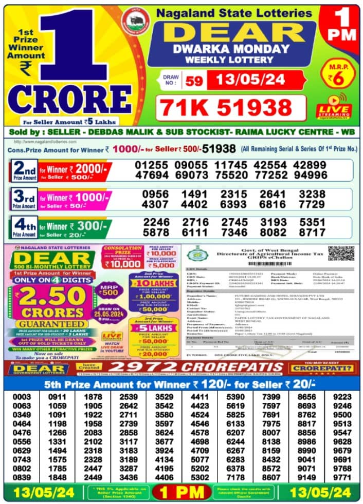 Nagaland DEAR DWARKA Morning 1 PM Result: 1st Prize Ticket No. 71K 51938