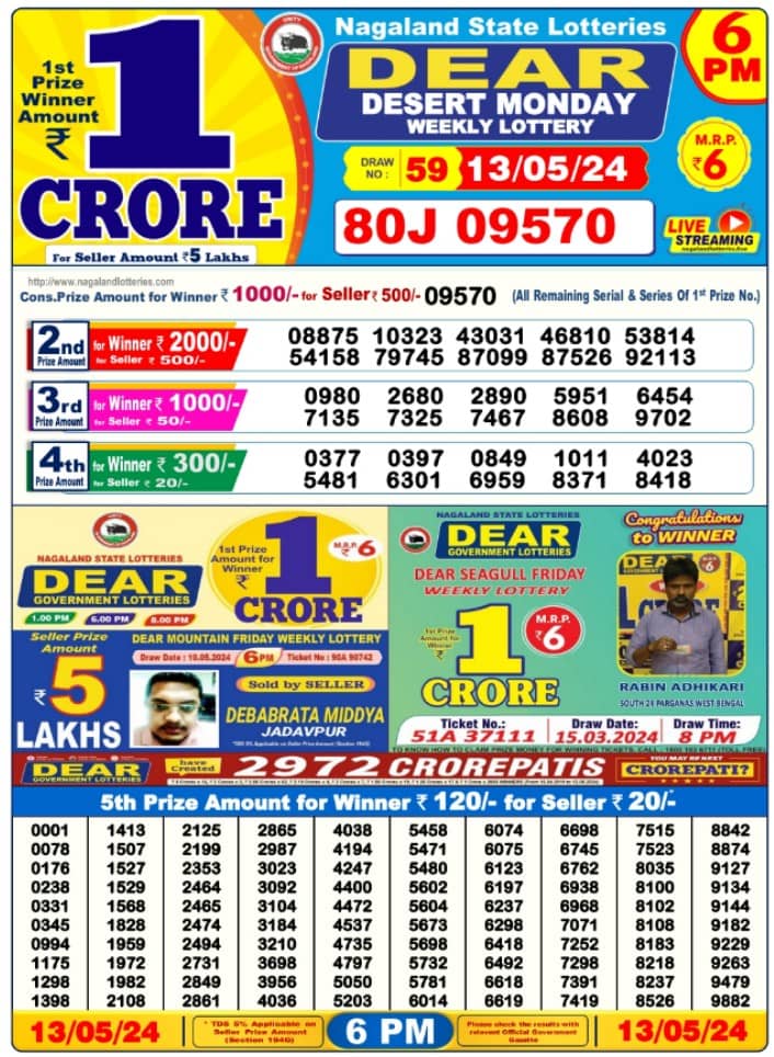 Nagaland Lottery Sambad Dear DESERT 6 PM Result OUT: 1st Prize Winner 1 CRORE