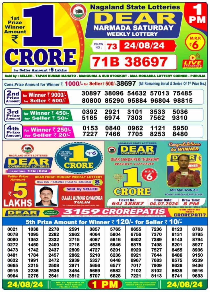 Nagaland State Lottery Saturday, 24 August, 2024: The results of Nagaland State Lottery DEAR NARMADA SATURDAY 1 PM, DEAR DONNER SATURDAY 6 PM, DEAR STORK EVENING 8 PM weekly lottery will be declared today i.e. Saturday, at 1 PM, 6 PM and 8 PM respectively. To view the list of winners, scroll down.
