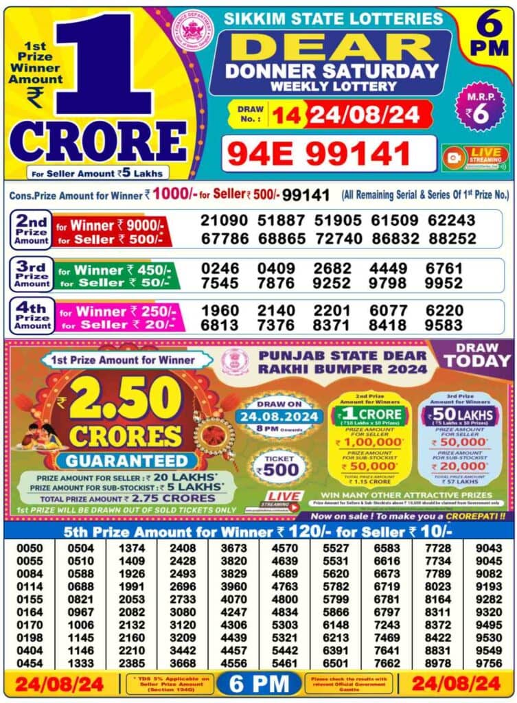 LIVE Nagaland Lottery Sambad Today (24.08.24) DEAR DONNER Saturday 1 PM OUT-1st Prize No. 94E 99141
