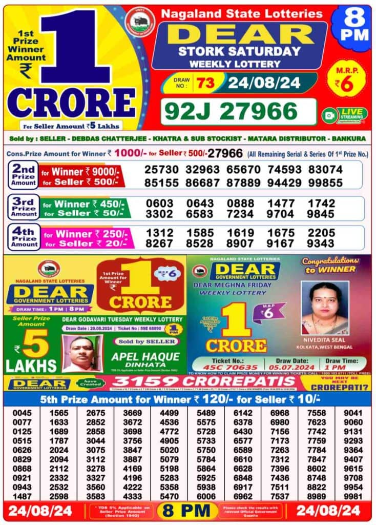 Nagaland Lottery Dear STORK Saturday 8 PM Result Out: 1st Prize 1 CRORE