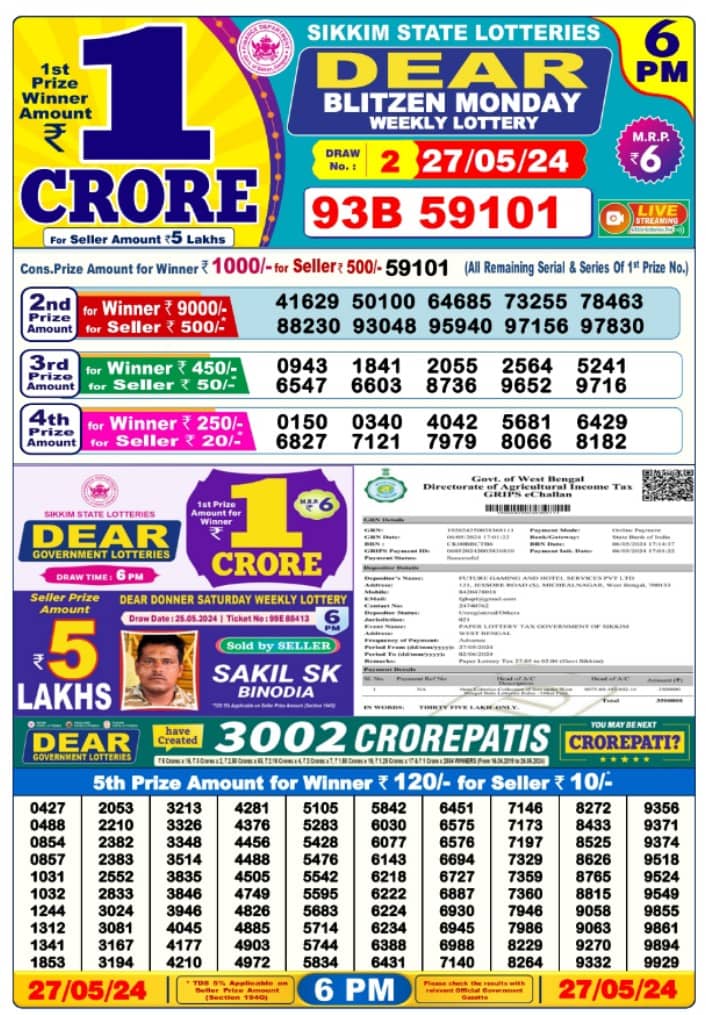 Nagaland DEAR 6 PM Result: 1st Prize Ticket No. 93B 59101