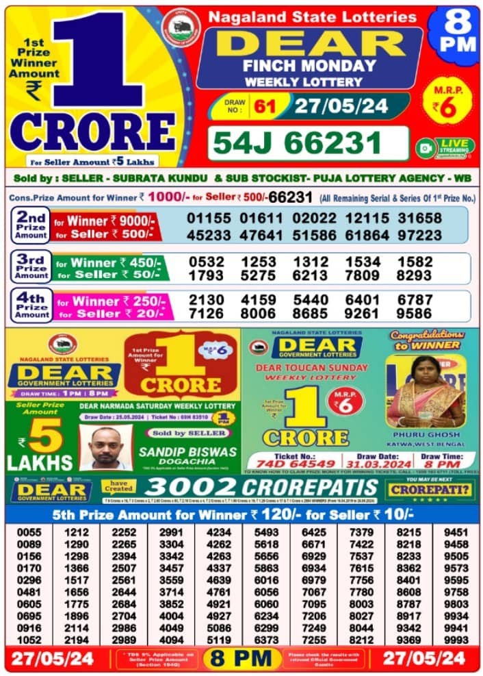 LIVE | Nagaland Lottery (27.05.2024) DEAR FINCH MONDAY 8 PM OUT-1st Prize Ticket No. 54J 66231