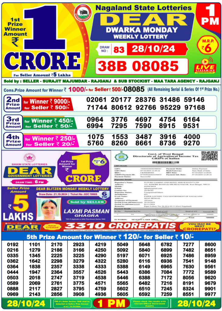 Nagaland State Lottery Monday, 28 October, 2024: The results of Nagaland State Lottery DEAR DWARKA MORNING 1 PM, DEAR DESERT DAY 6 PM, DEAR FINCH EVENING 8 PM weekly lottery will be declared today i.e. Monday, at 1 PM, 6 PM and 8 PM respectively. To view the list of winners, scroll down.