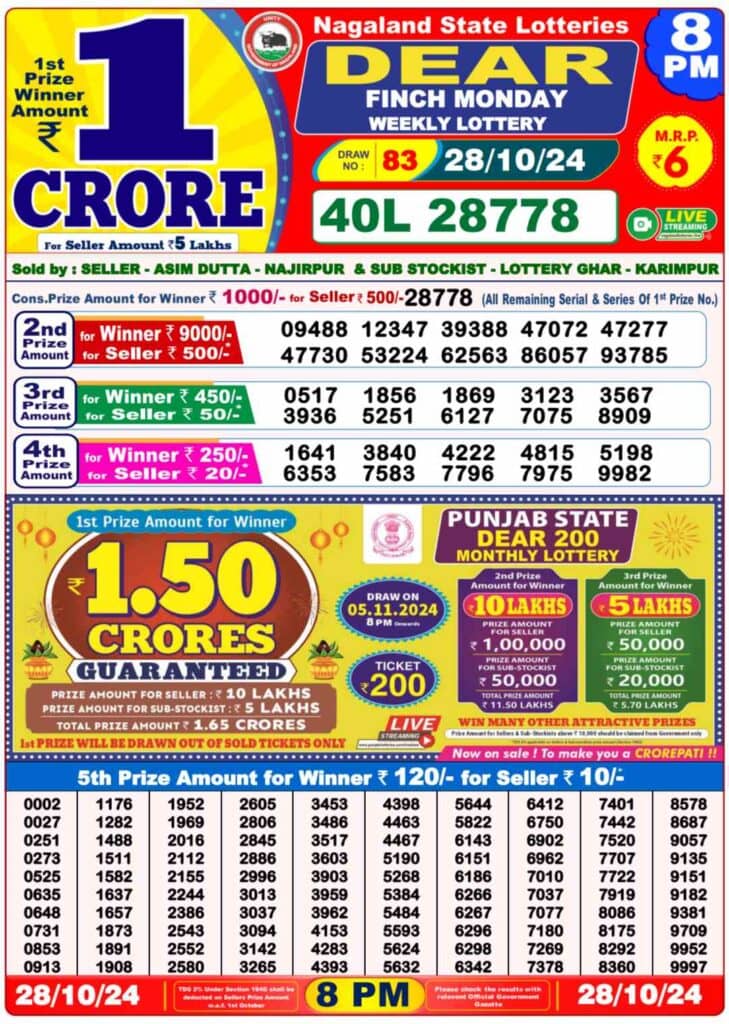 LIVE | Nagaland Lottery (28.10.2024) DEAR FINCH MONDAY 8 PM OUT- 1st Prize Ticket No. 40L 28778