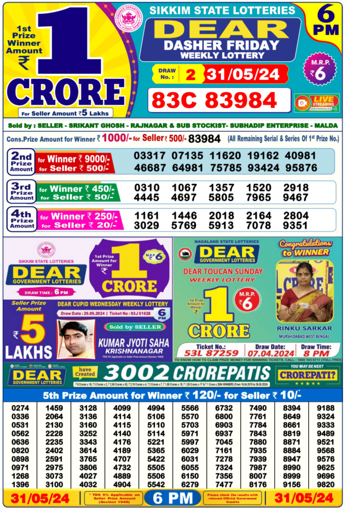 In order to provide the state government with a stable source of income, the Finance Department oversaw the establishment of the Nagaland State Lottery in 1972. Every day of the week, the Nagaland Lottery Sambad is held at three distinct times of the day: morning, day, and evening. The lottery is held every day under a different name with varying prize money, with Rs. 1 crore (plus the Super Prize amount) as the highest reward. Nagaland State conducts three daily lotteries: Dear Morning, Dear Day, and Dear Evening. Tickets for these lotteries cost Rs. 6 a piece. Nagaland Lottery Today will also have 3 winners, Dear Mahanadi Winners, Dear Lake Winners, Dear Sandpiper Winners.