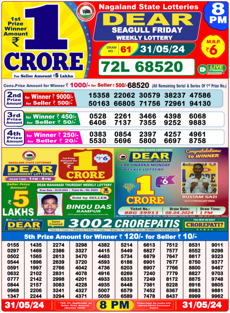 LIVE | Nagaland Lottery Sambad (31.05.2024) DEAR SEAGULL Friday 8 PM- 1st Prize Ticket No. 72L 68520