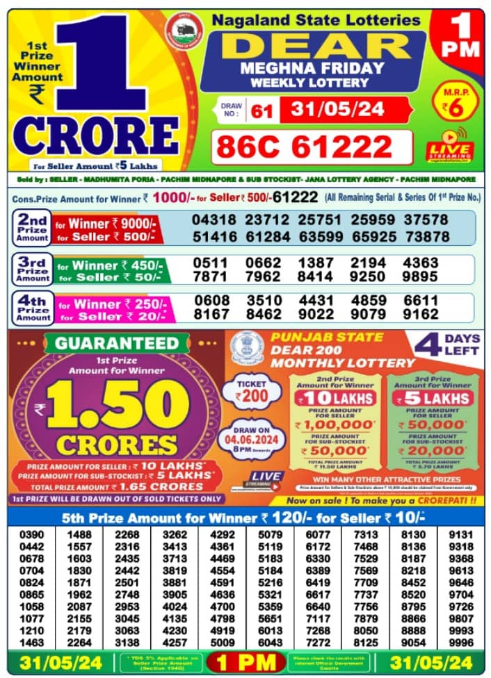 Nagaland DEAR MEGHNA Morning 1 PM Result: 1st Prize Ticket No. 86C 61222