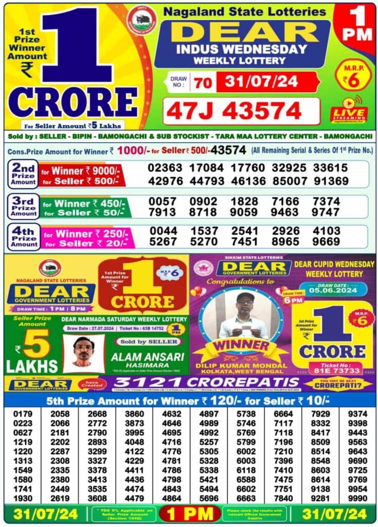 Nagaland Lottery Wednesday, 17 July, 2024: The results of Nagaland State Lottery DEAR INDUS MORNING 1 PM, DEAR CUPID 6 PM, DEAR PELICAN EVENING 8 PM weekly lottery will be declared today i.e. Wednesday, at 1 PM, 6 PM and 8 PM respectively. To view the list of winners, scroll down.