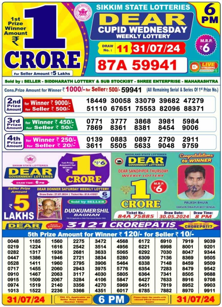 Nagaland DEAR CUPID Day 6 PM Result: 1st Prize Ticket No. 87A 59941