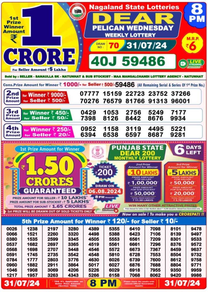 Nagaland Lottery Dear PELICAN Result: 1st Prize Ticket No. 40J 59486