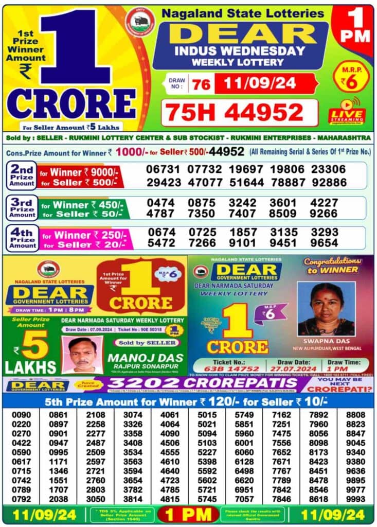 Nagaland DEAR INDUS Morning 1 PM Result: