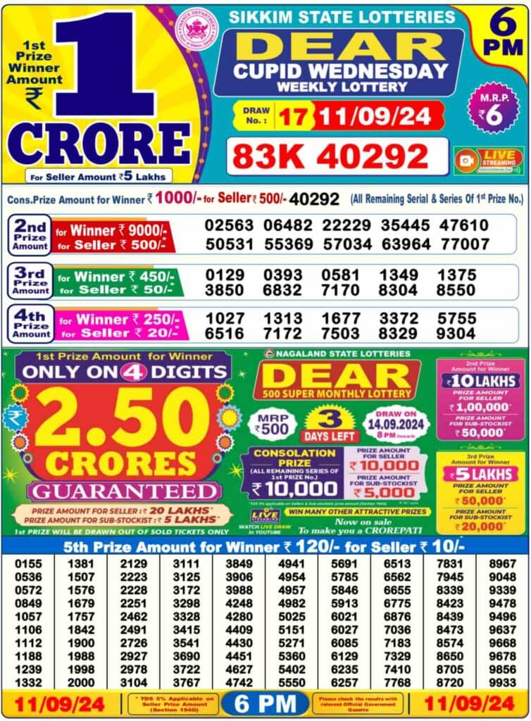 LIVE | Nagaland Lottery SAMBAD Today: DEAR CUPID 6 PM Draw OUT-1st Prize Ticket No 83K 40292