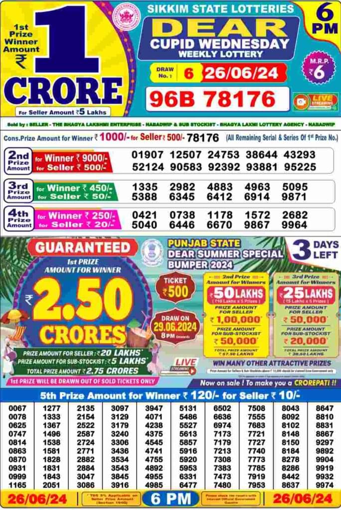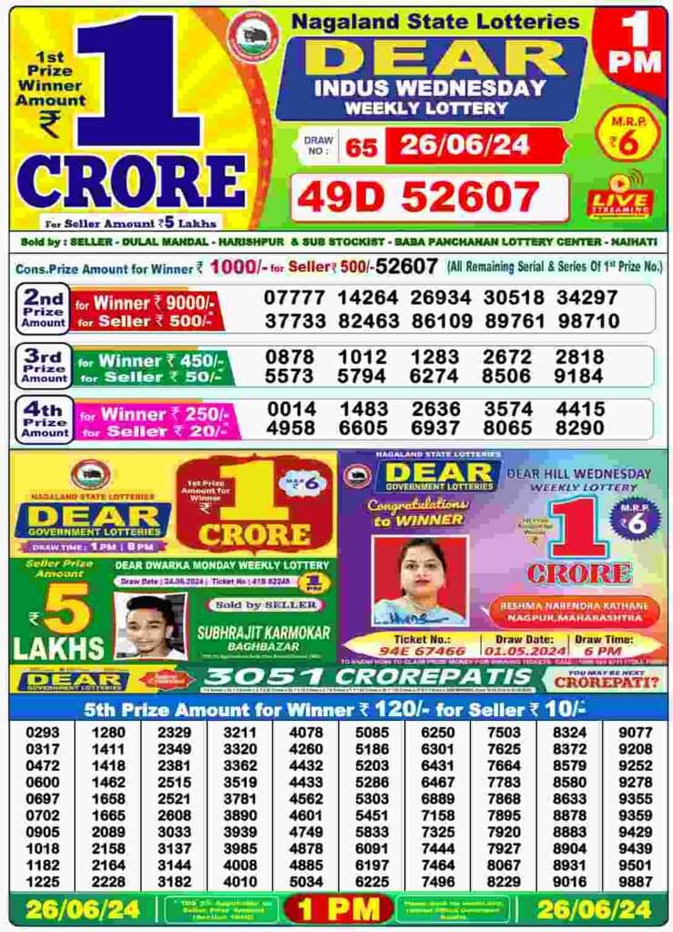 Nagaland Lottery Wednesday, 26 June, 2024: The results of Nagaland State Lottery DEAR INDUS MORNING 1 PM, DEAR CUPID 6 PM, DEAR PELICAN EVENING 8 PM weekly lottery will be declared today i.e. Wednesday, at 1 PM, 6 PM and 8 PM respectively. To view the list of winners, scroll down.