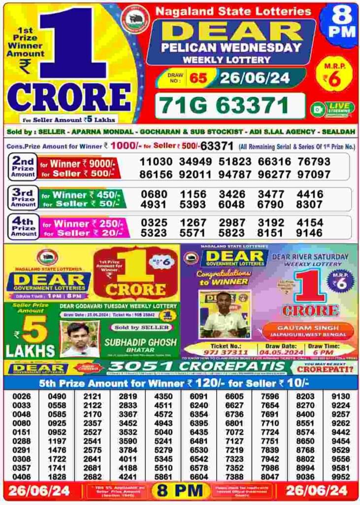 Nagaland DEAR PELICAN Evening 8 PM Result: 1st Prize Ticket No. 71G 63371