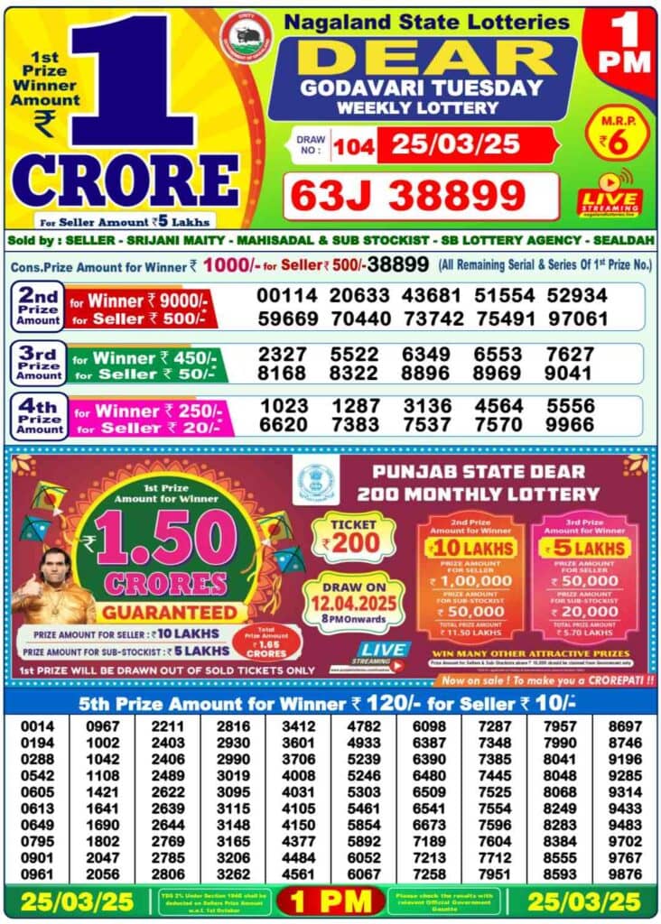 Nagaland State Lottery Tuesday, 25 March, 2025: The results of Nagaland State Lottery DEAR GODAVARI MORNING 1 PM, DEAR COMET DAY 6 PM, DEAR GOOSE EVENING 8 PM weekly lottery will be declared today i.e. Tuesday, at 1 PM, 6 PM and 8 PM respectively.
