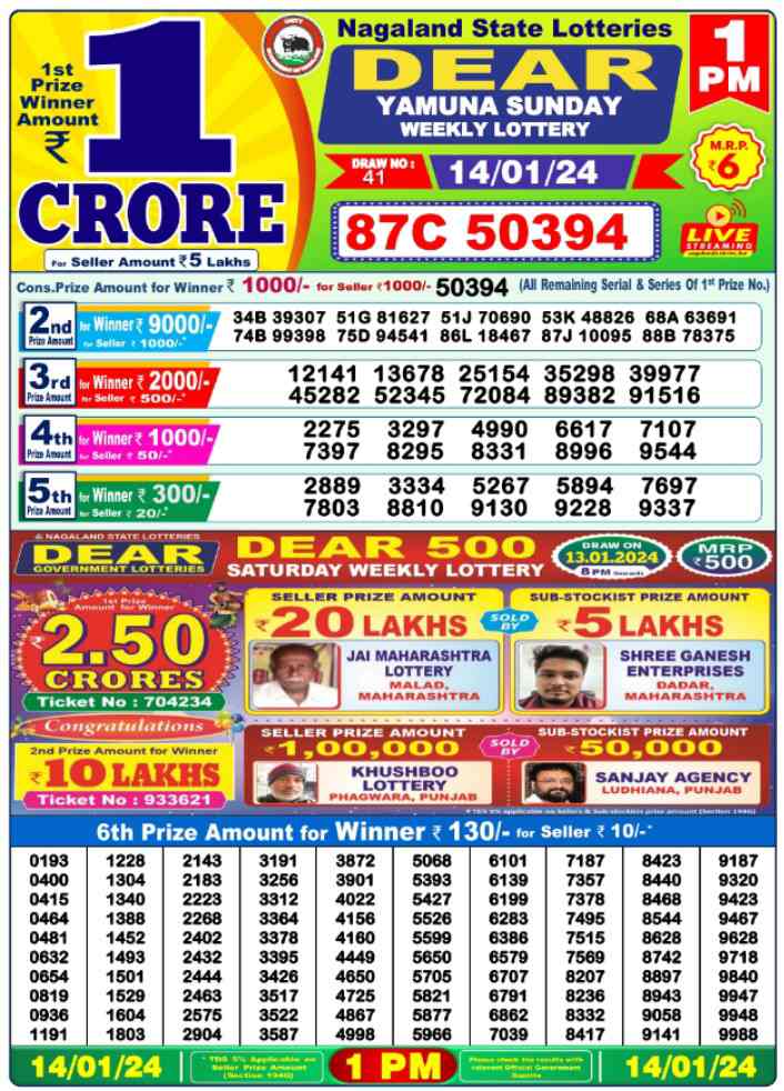 Nagaland State Lottery Sunday, 14 January, 2024: The results of Nagaland State Lottery DEAR YAMUNA MORNING 1 PM, DEAR SEA EVENING 6 PM, DEAR TOUCAN NIGHT 8 PM weekly lottery will be declared today i.e Sunday, at 1 PM, 6 PM and 8 PM respectively. To view the list of winners, scroll down.