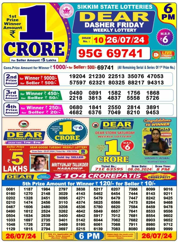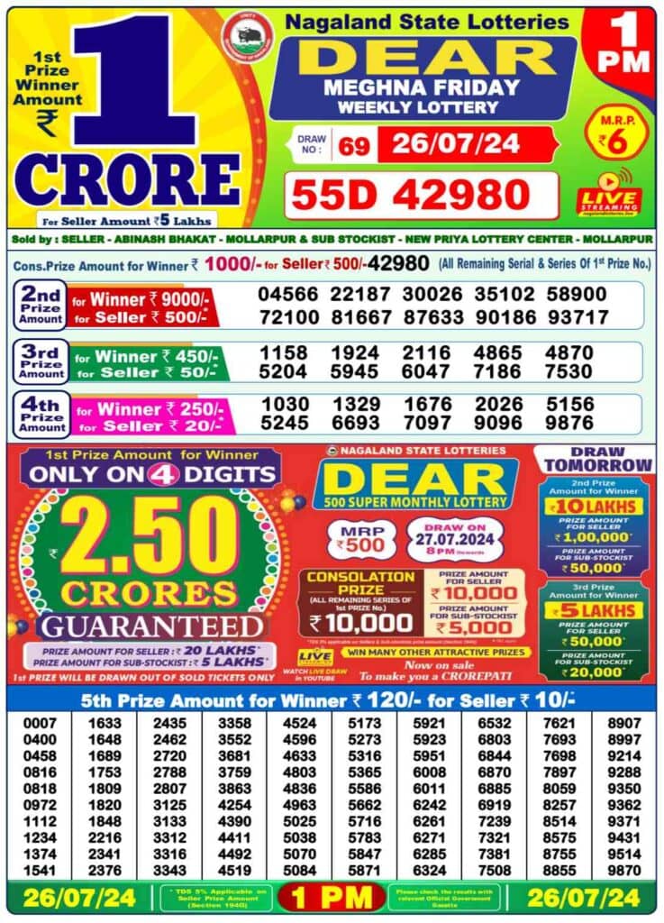 Nagaland State Lottery Friday, 26 July, 2024: The results of Nagaland State Lottery DEAR MEGHNA MORNING 1 PM, DEAR DASHER DAY 6 PM, DEAR SEAGULL EVENING 8 PM weekly lottery will be declared today i.e Friday, at 1 PM, 6 PM and 8 PM respectively. To view the list of winners, scroll down.