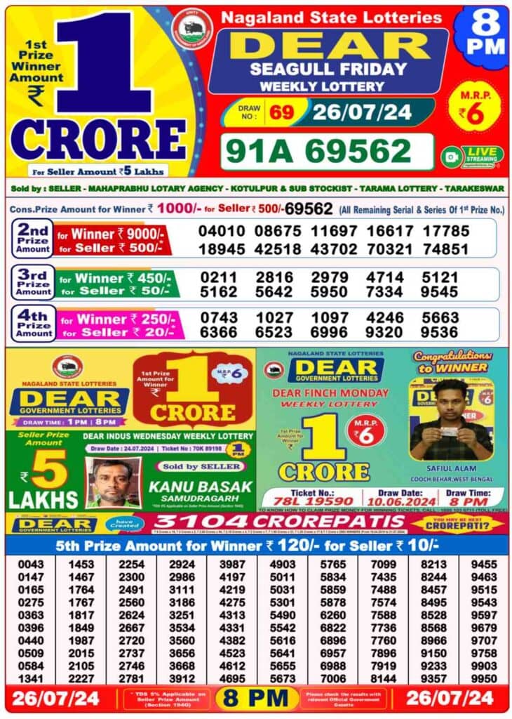 Nagaland Dear SEAGULL 8 PM Result: 1st Prize Ticket No. 91A 69562
