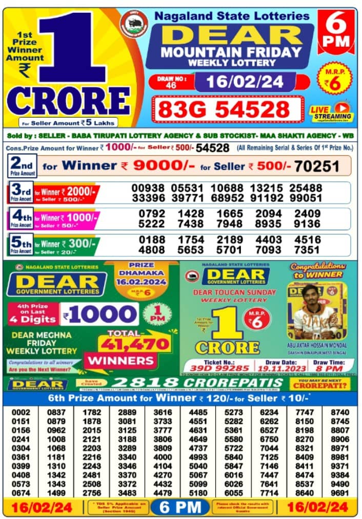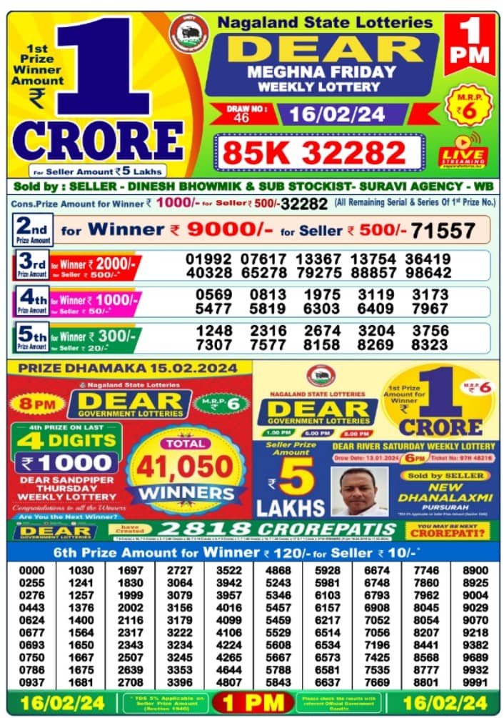 Nagaland State Lottery Friday, 13 February, 2024: The results of Nagaland State Lottery DEAR MEGHNA MORNING 1 PM, DEAR MOUNTAIN DAY 6 PM, DEAR SEAGULL EVENING 8 PM weekly lottery will be declared today i.e Friday, at 1 PM, 6 PM and 8 PM respectively. To view the list of winners, scroll down.