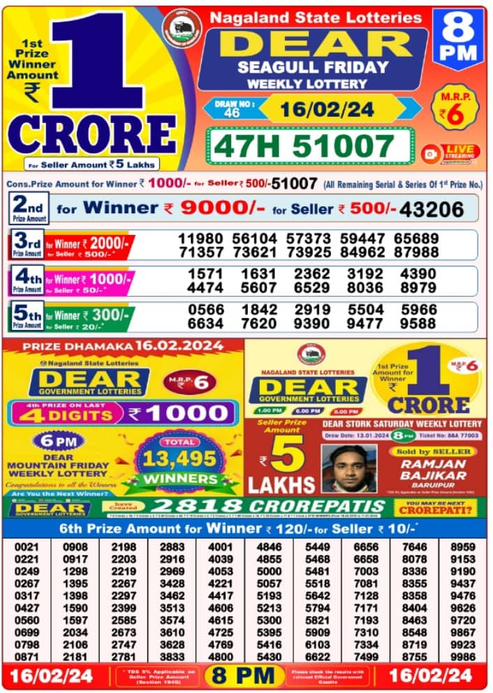 LIVE | Nagaland Lottery Result 16.02.2024: DEAR SEAGULL Friday Draw 8 PM OUT - Ticket No. 47H 51007