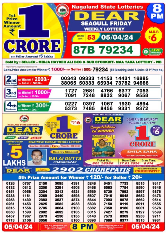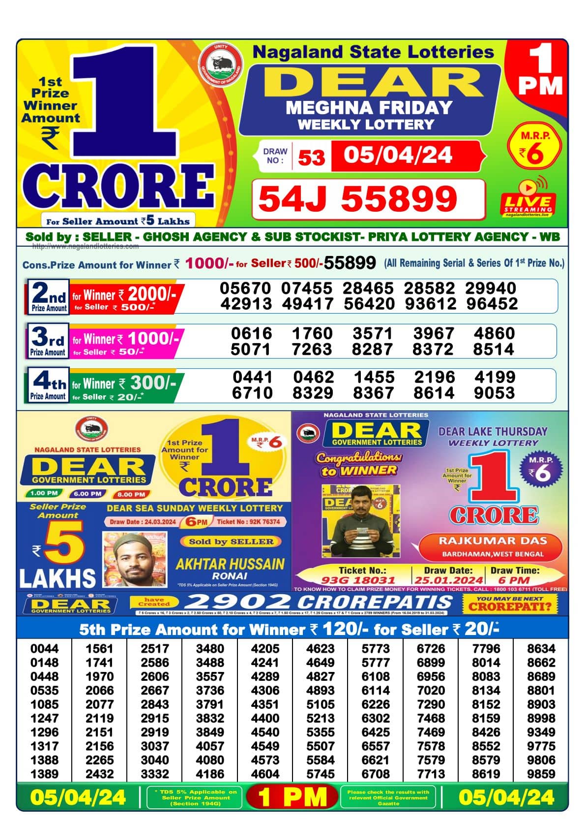 Nagaland State Lottery Friday, 5 April, 2024: The results of Nagaland State Lottery DEAR MEGHNA MORNING 1 PM, DEAR MOUNTAIN DAY 6 PM, DEAR SEAGULL EVENING 8 PM weekly lottery will be declared today i.e Friday, at 1 PM, 6 PM and 8 PM respectively. To view the list of winners, scroll down.