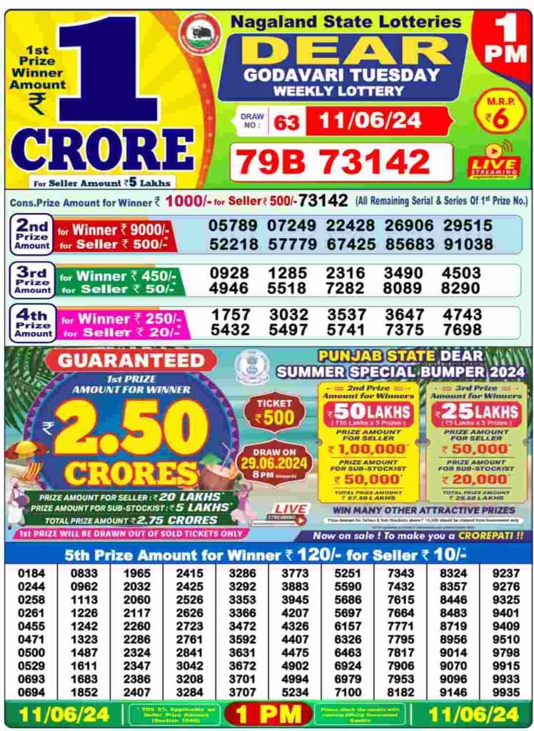 Nagaland State Lottery Tuesday, 11 June, 2024: The results of Nagaland State Lottery DEAR GODAVARI MORNING 1 PM, DEAR WAVE DAY 6 PM, DEAR GOOSE EVENING 8 PM Week.