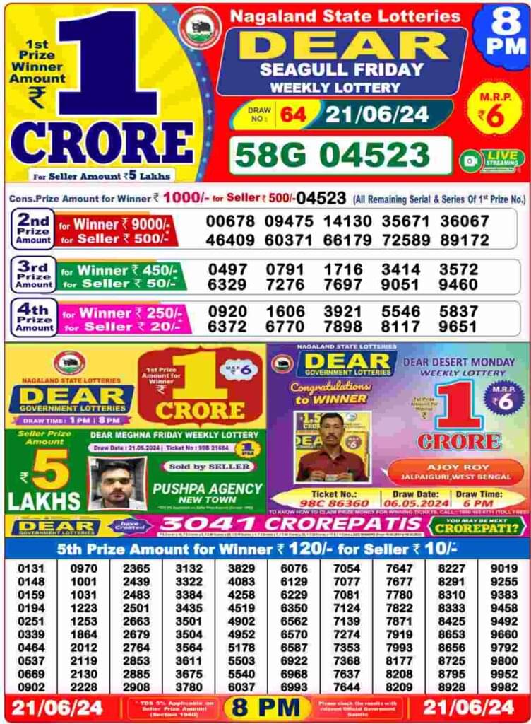 Nagaland Lottery Dear SEAGULL Saturday 8 PM Result Out: 1st Prize Ticket No 58G 04523