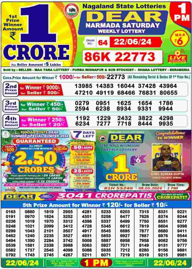Nagaland State Lottery Saturday, 22 June, 2024: The results of Nagaland State Lottery DEAR NARMADA SATURDAY 1 PM, DEAR RIVER SATURDAY 6 PM, DEAR STORK EVENING 8 PM weekly lottery will be declared today i.e. Saturday, at 1 PM, 6 PM and 8 PM respectively. To view the list of winners, scroll down.