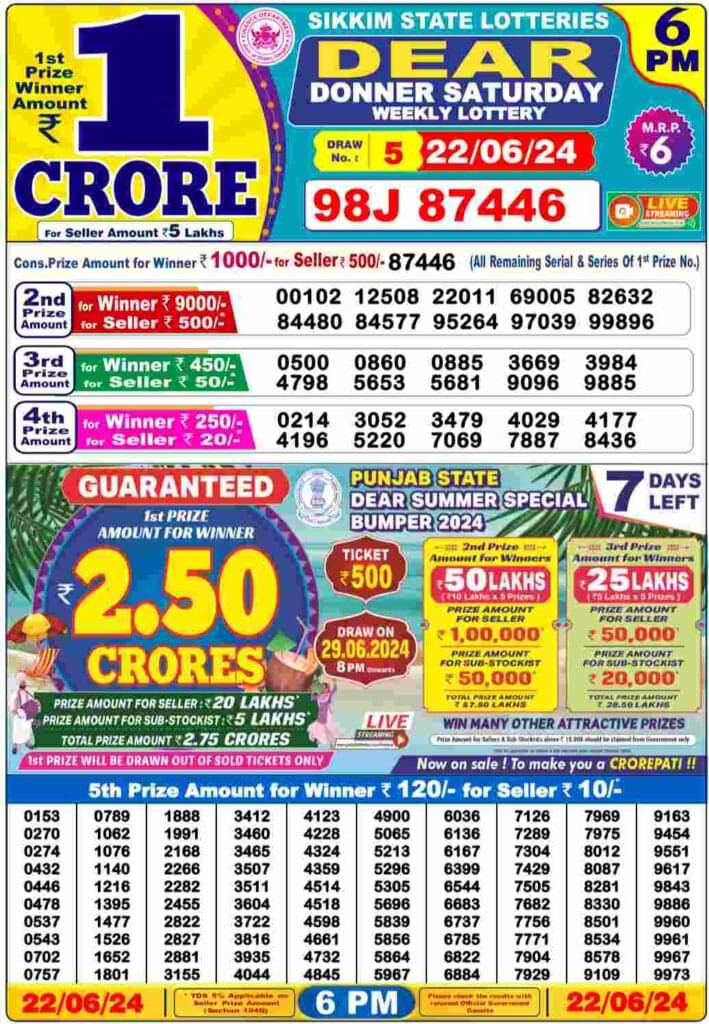 Dear DONNER Saturday 6 PM Lucky Winners: 1st Prize Ticket No. 98J 87446