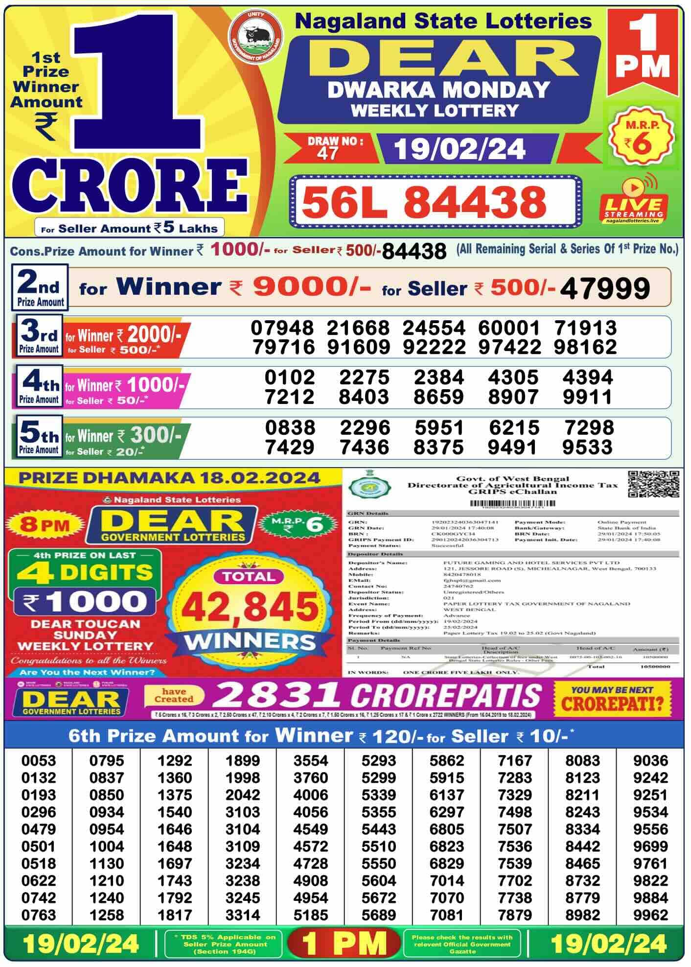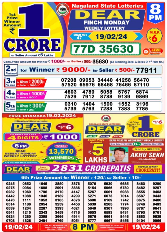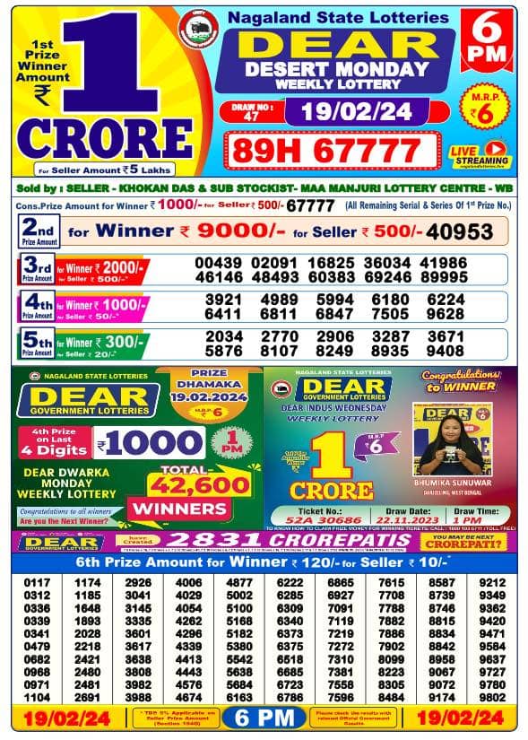 Nagaland State Lottery Monday, 19 February, 2024: The results of Nagaland State Lottery DEAR DWARKA MORNING 1 PM, DEAR DESERT DAY 6 PM, DEAR FINCH EVENING 8 PM weekly lottery will be declared today i.e. Monday, at 1 PM, 6 PM and 8 PM respectively. To view the list of winners, scroll down.