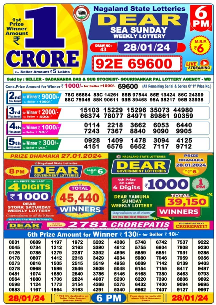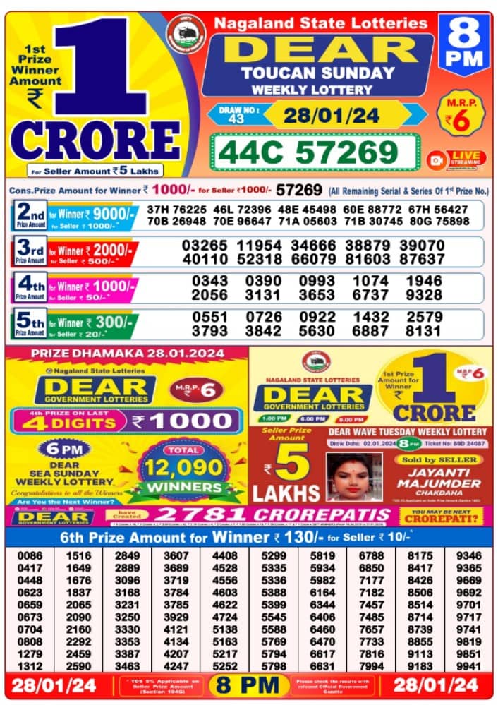 Nagaland State Lottery Sunday, 28 January, 2024: The results of Nagaland State Lottery DEAR YAMUNA MORNING 1 PM, DEAR SEA EVENING 6 PM, DEAR TOUCAN NIGHT 8 PM weekly lottery will be declared today i.e Sunday, at 1 PM, 6 PM and 8 PM respectively. To view the list of winners, scroll down.