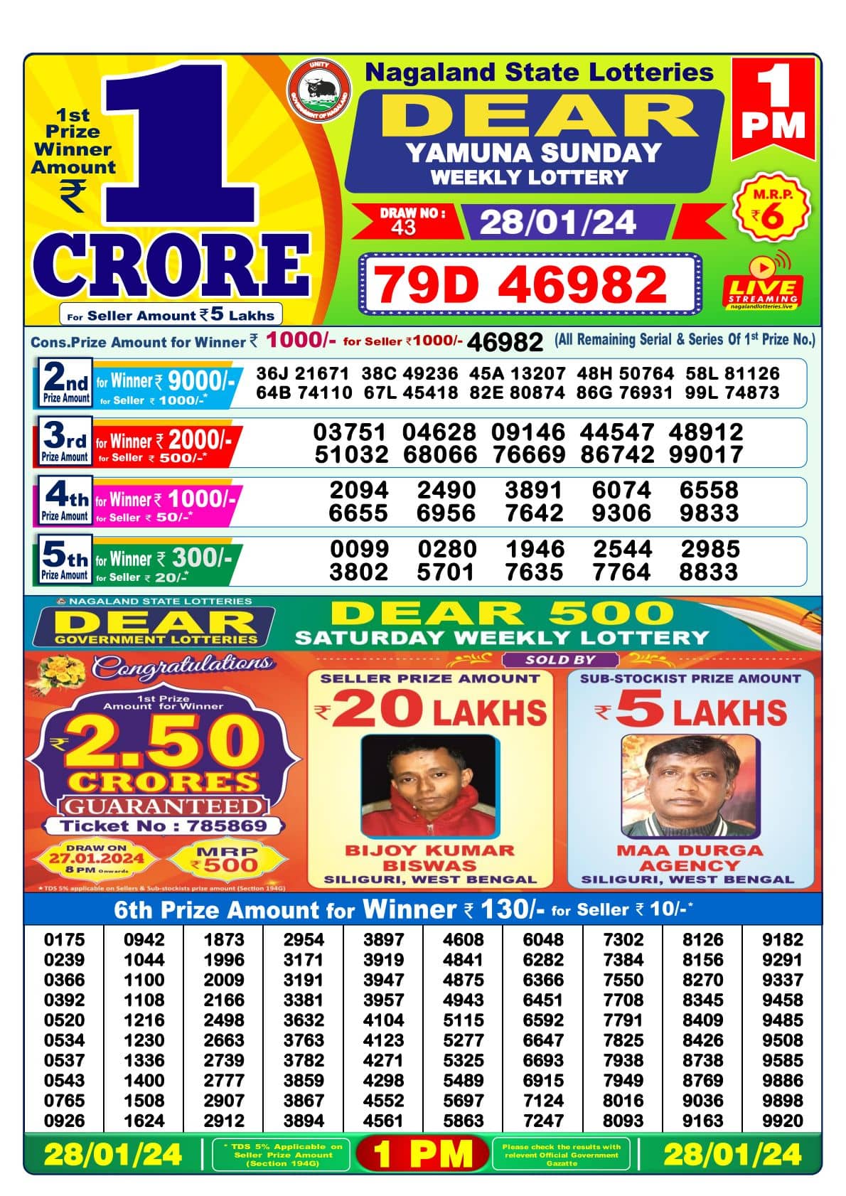 Dear YAMUNA 1 PM Lucky Winner: 1st Prize Ticket No 79D 46982