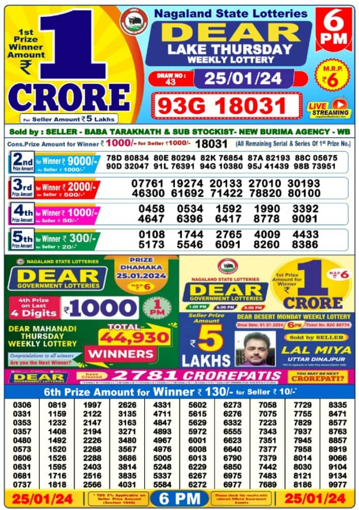 Nagaland DEAR LAKE Day 6 PM Result: 1st Prize Ticket No 93G 18031