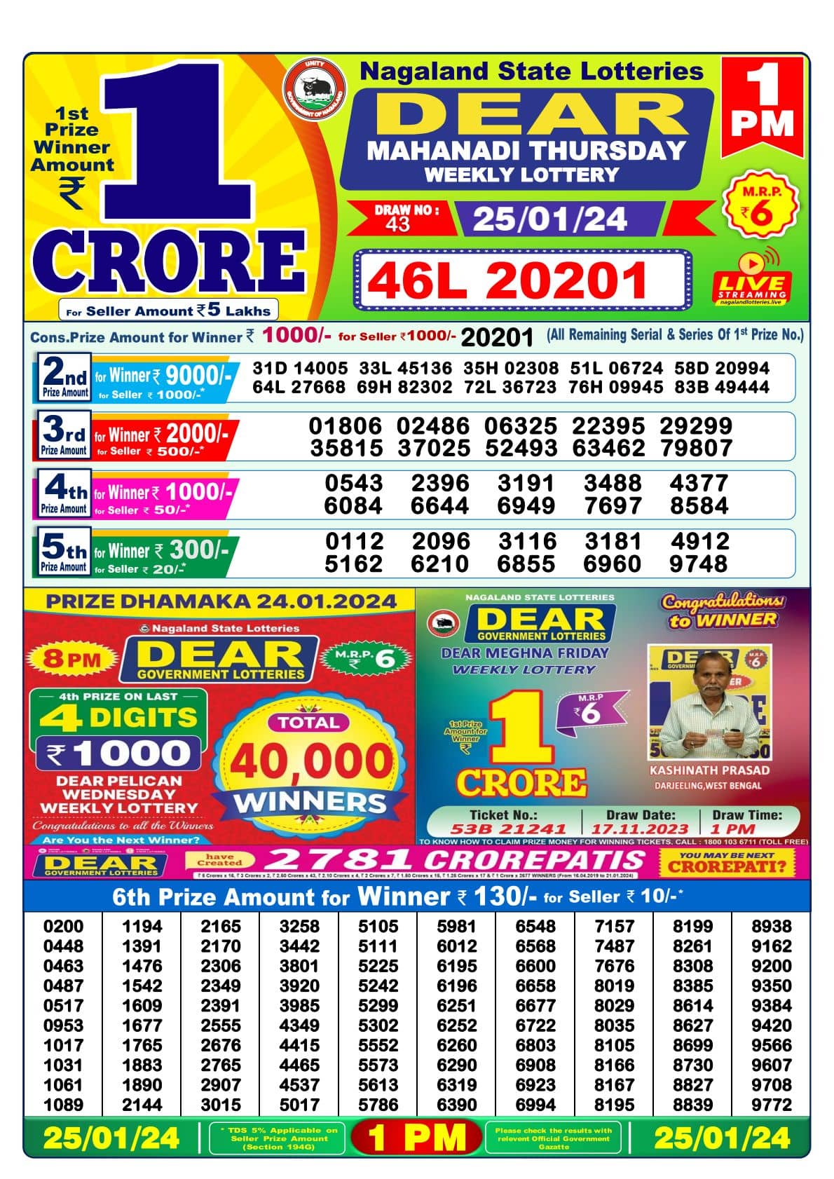 Nagaland DEAR MAHANADI Morning 1 PM Result: 1st Prize Ticket No 46L 20201