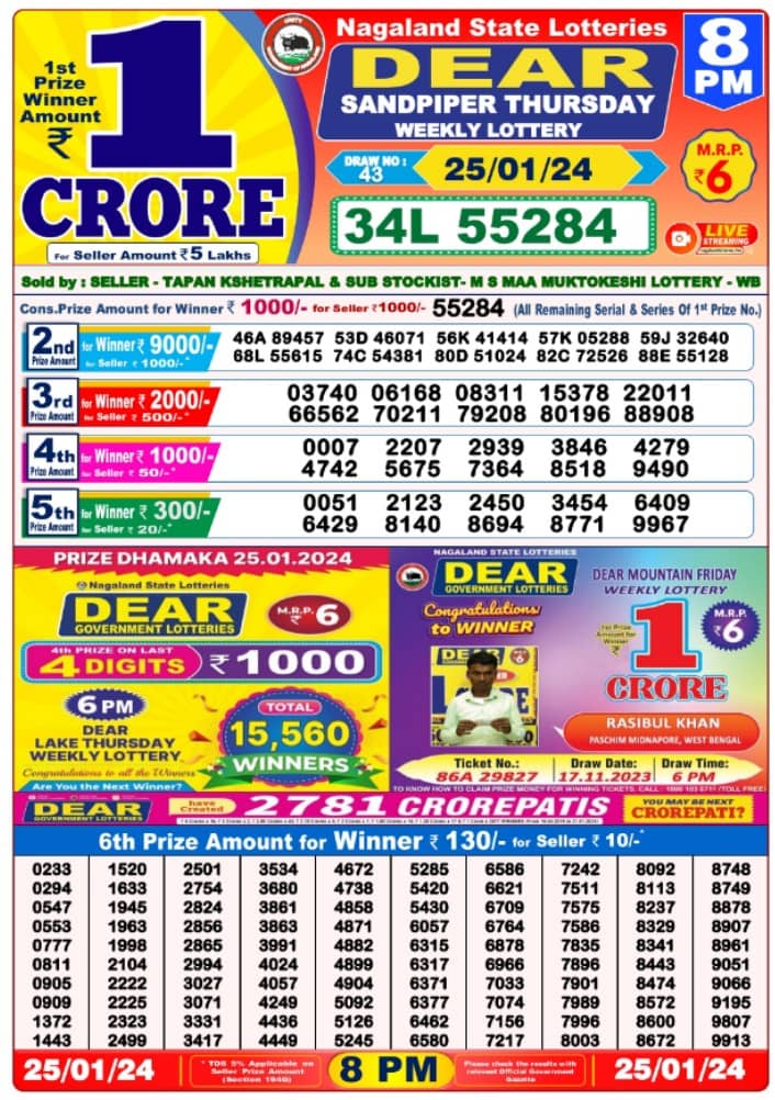 Nagaland Lottery THURSDAY, 25 January, 2024: The results of Nagaland State Lottery DEAR MAHANADI MORNING 1 PM, DEAR LAKE DAY 6 PM, DEAR SANDPIPER EVENING 8 PM weekly lottery will be declared today i.e WEDNESDAY, at 1 PM, 6 PM and 8 PM respectively. To view the list of winners, scroll down.