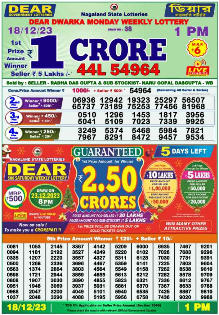 Nagaland State Lottery Monday, 18 December, 2023: The results of Nagaland State Lottery DEAR DWARKA MORNING 1 PM, DEAR DESERT EVENING 6 PM, DEAR FINCH NIGHT 8 PM weekly lottery will be declared today i.e Monday, at 1 PM, 6 PM and 8 PM respectively. To view the list of winners, scroll down.