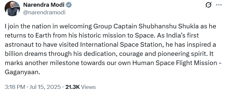 Greeting Shukla and the rest of the Axiom-4 mission crew, Prime Minister Narendra Modi posted on X (formerly Twitter), saying: I join the nation in welcoming Group Captain Shubhanshu Shukla as he returns to Earth from his historic mission to Space. As India's first astronaut to have visited International Space Station, he has inspired a billion dreams through his dedication, courage and pioneering spirit. It marks another milestone towards our own Human Space Flight Mission - Gaganyaan.
