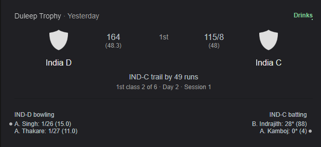 India C took a four-run lead against India D and scored 168 before being bowled out. D Team's 2nd Innings will start soon.