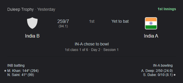 After the klunch break, Musheer Khan has held on to his position as India A remain wicketless before lunch. They need to scalp some breakthroughs. On the other hand, India D's second innings officially commence.