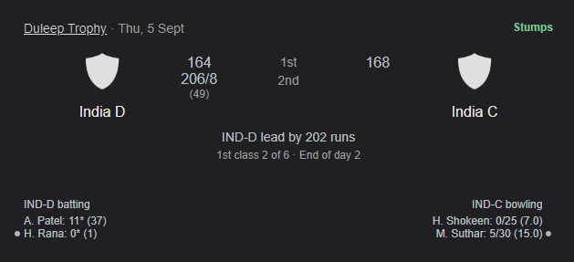 IND C vs IND D: Axar Patel dismissed after 59-ball 28